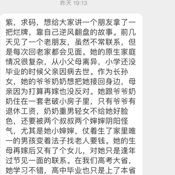 【紫,求码,想给大家讲一个朋友拿了一把烂牌,靠自己逆风翻盘的故事。